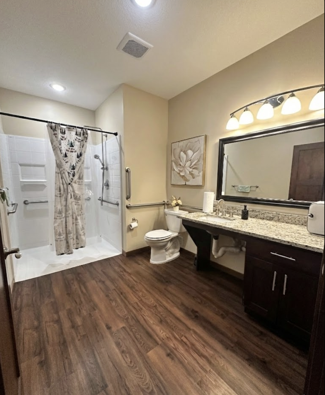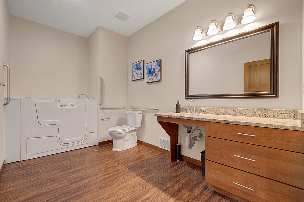 Each resident has a spacious private bedroom with large windows, along with access to thoughtfully designed bathroom spaces created to support comfort, dignity, and ease of care. The bathrooms are generously sized to allow for mobility support and caregiver assistance, providing safety without sacrificing a home-like feel.